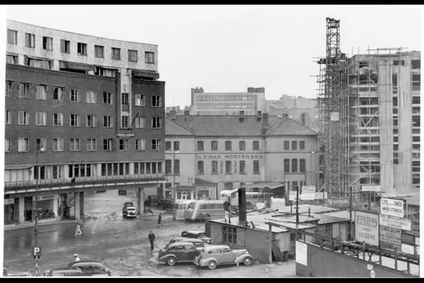Østre del av Fridtjof Nansens plass. A/S Einar Mortensen møbelforretning (i nummer 7). Inngjerdet brakkeområde på plassen. Gatemiljø (bilparkering). Forretningsgård under oppførelse. Reklameplakater og skilt.