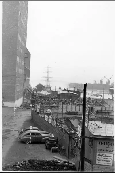 Sydvestre hjørne av Fridtjof Nansens plass. Inngjerdet byggeområde. Del av vestre rådhustårn. Bilparkering. Sikt mot havneområde. Seilskip ved havna i bakgrunnen.