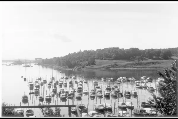 Frognerkilen med småbåter. Bygdøy med Dronningen og Frammuseet i bakgrunnen. Tilbakemelding fra bruker: ", på bakgrunn av private bilder, at A-20145/Uab/0010/013 er tatt i ca. 1946 fra verandaen til arkitekt Jens Selmer i Bygdø allé 115 A, 3. etasje."