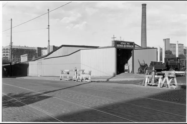 Brødrene Mikkelsens bilverksted og utsalg fra Brenselcentralen i Bentsebrugata 15/17. Trikkelinje. Lastebil og kjerre. Fabrikkpipe på tidligere Bentse Brug i bakgrunnen.