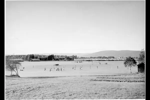 Fotballkamp på sletta. Tyskerbrakker til venstre. Driftsbygningen på Smedstua gård ved trikkelinje Simensbråten - Jomfrubråten i bakgrunnen. Drenering på eng.