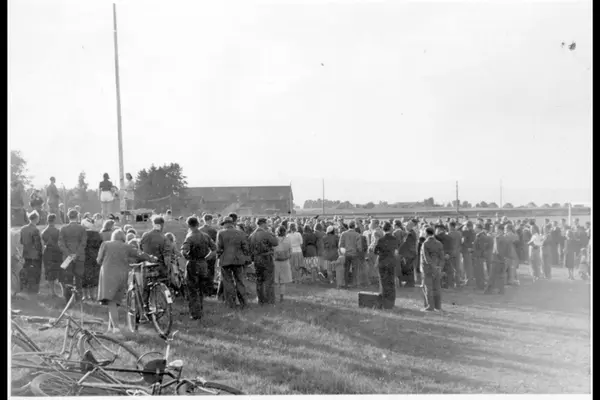 Innvielses / Åpningsseremoni på sletta med tale og flaggheising. (Jfr. bilder A-20145/Uae/0006/001 og 003.) (Sletta ble offisielt åpnet sommeren 1948.) Driftsbygningen til Smedstua gård i bakgrunnen, ved trikkelinjen Jomfrubråten - Simensbråten. Sykler.