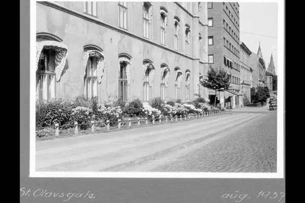 St. Olavs gate med Aars og Voss skole nærmest. Blomsterprydet forhage. (Idag ligger Radisson SAS Scandinavia Hotel på adressen.) Hybelhus i nummer 31, på andre siden av Tullins gate (nå Thon Hotel Europa.) Tårnet på St. Olavs kirke lengst i bakgrunnen.