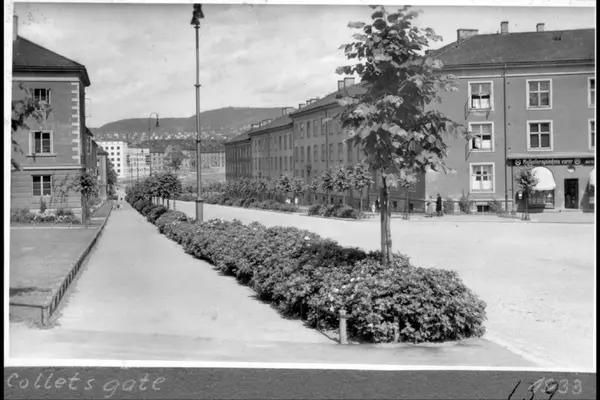 Colletts gate ned mot Uelands gate. Melkebutikk på hjørnet (Diriks gate 7). Forhager med blomsterbed. Blomsterrader med trær mellom gangvei og gate. Bebyggelsen tilhører Ilaløkken-kvartalene (Ila-byen). Kommentar fra bruker: "Strykejernsgården" til høyre i bildet der Diriks gate går inn til høyre. Butikken inneholdt kolonial og kjøttbutikk, og ble senere overtatt av Samvirkelaget med Gadderud som bestyrer! Ser så vidt den øverste porten inn i gården bak treet!