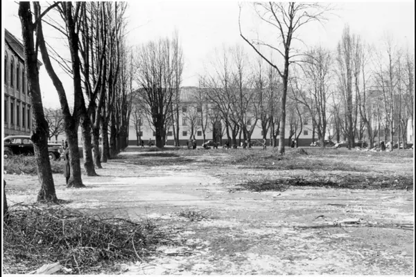Arbeidere med kvist- og trerydding på plassen. Parkerte biler. Kirkegata 1-3 i bakgrunnen. Albumtittel: Gråbeinsletta og anlegg ved Sagene kirke. Grev Wedels plass, Grønland