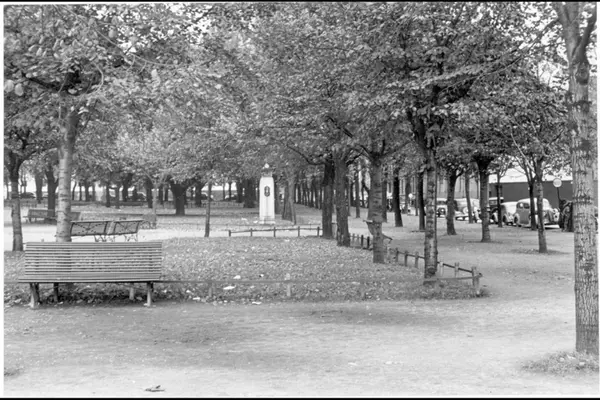 Sentrale Grev Wedels plass (sett mot vest) med nedstigningstårn, parkbenker og gangveier. Trerekker langs sidene. Parkerte biler langs Myntgata. Albumtittel: Gråbeinsletta og anlegg ved Sagene kirke, Grev Wedels plass, Grønland