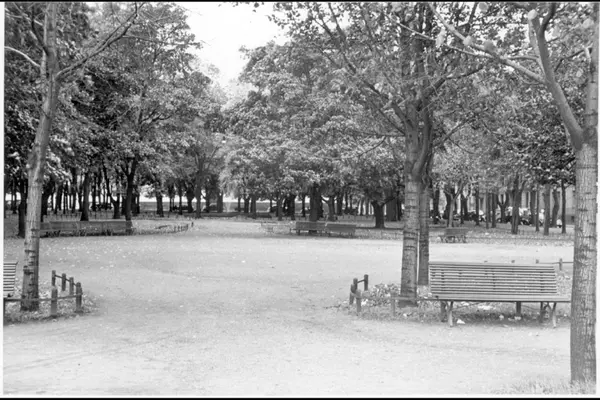 Sentrum av Grev Wedels plass, sett mot vest. Parkbenker og gangveier. (Ny fontene ennå ikke anlagt.) Albumtittel: Gråbeinsletta og anlegg ved Sagene kirke, Grev Wedels plass, Grønland