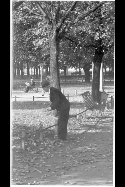 Fra Grev Wedels plass (sett mot vest). Parkbenker. Mann mater fuglene, en annen sitter og leser avisen. Albumtittel: Gråbeinsletta og anlegg ved Sagene kirke, Grev Wedels plass, Grønland