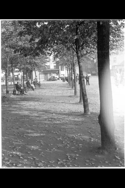 Østre? ende av Grev Wedels plass. Folk på parkbenker. Myntgata i bakgrunnen. Akershusstranda til høyre. (Jfr.bilde A-20145/Uag/0002/019.) Albumtittel: Gråbeinsletta og anlegg ved Sagene kirke, Grev Wedels plass, Grønland