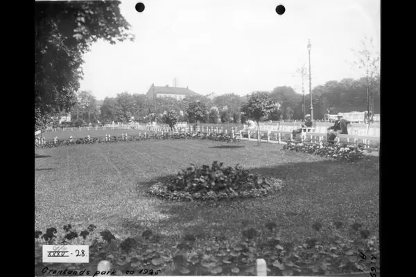 Parken med parkbenker, gangveier, blomsterbed, busker og plener. Oslo kretsfengsel (Botsfengselet) i bakgrunnen. Albumtittel: Gråbeinsletta og anlegg ved Sagene kirke, Grev Wedels plass, Grønland