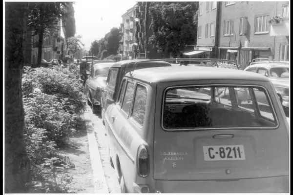 Busk-beplantning langs brosteinskant. Parkerte biler. Leketøysbutikk. (Samme gata som på bilde A-20145 / Uag / 0005 / 001.) Sannsynlig fra 1960-tallet.