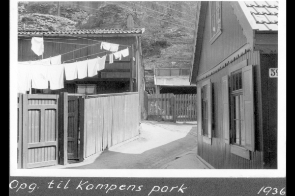 Trehusbebyggelse nord i Brinken (tidl. Brinkens gate) under skrenten nedenfor Kampen park. Brinken 59 til høyre, skomakerverksted til venstre. Klestørk.