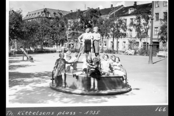 Barn i lek med karusell på plassen nederst i Thorvald Meyers gate mot Søndre gate (i bakgrunnen). Vippehuske og huskestativ. Parkbenker. (Minigolfbane idag)