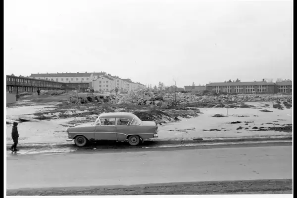 Lambertseter stadion under opparbeidelse med grunn / steinfylling. Feltspatveien med parkert bil i forgrunnen. Lambertseter skole til høyre i bakgrunnen, blokkbebyggelse i Glimmersvingen og Glimmerveien 44 til venstre.