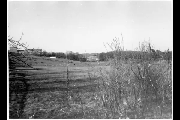 Friområde. Unger i fotball-lek på idrettsplass på øvre Marienlystjordet (før NRK ble bygget fra 1938). Tørtberg-jordet i forgrunnen. Fysikkbygningen på Universitetet på Blindern bak til venstre. Vestre Aker kirke bak til høyre.