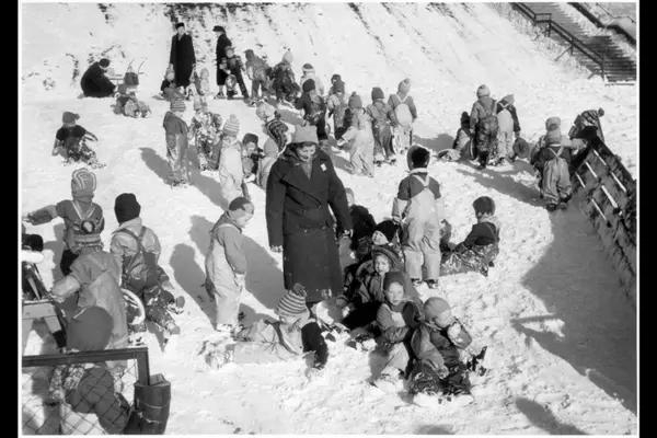 Vinterkledde barn i ake- og sklie-lek under parktantens og andre voksnes tilsyn. Fra Holmekollbakken (jf. trappene i bakgrunnen) der det var barnehage på 1940-tallet.