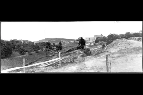 Nedre del av Torshovdalen. Oppdyrkede parseller. Sinsenblokker bakerst (i Trondheimsveien og Siloveien). Bebyggelse i Johan Selmers gate bak til venstre. Grefsenåsen bakerst.