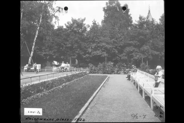 Plassen mellom Parkveien, Reichweins gate og Observatoriegata (nåværende Bervens løkke). Folk på parkbenker. Blomsterbed, busker og plen, grusganger. Barnevogn. Ankerparken bakenfor. (Jfr. bilde A-20145/U/0003/044)