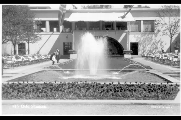 I haven til restaurant Skansen. Fontene. Serveringsbord og serveringspersonale. Kontraskjæret ved Rådhusplassen. Funksjonalistisk arkitektur. Postkort 815.