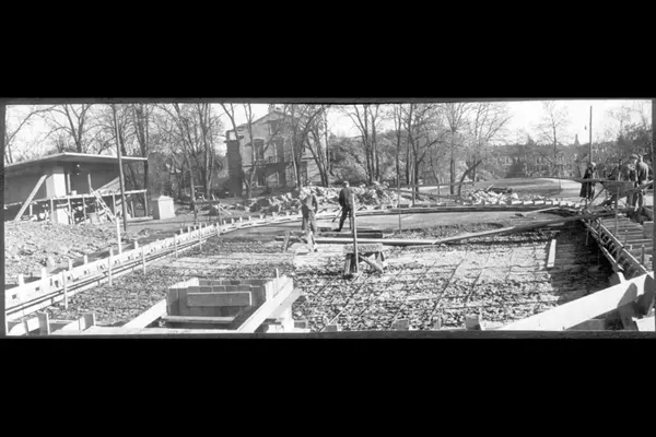 Opparbeidelse av vassebassenget / plaskedammen på toppen av parken. Arbeidere med sementlegging på armeringsjern over stein- og grusunderlag. Leskur i funkis-stil til venstre.