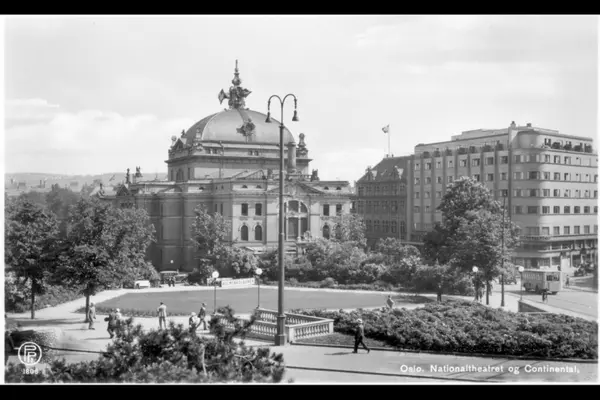 Byen sett fra nederste del av Abelhaugen. Nationaltheatret i senter og Hotel Continental og Theatercafeen til høyre. Nedgangen til Holmenkollbanen i forgrunnen. Postkort PPI 1806.