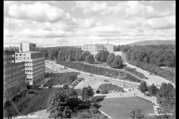 Utsikt mot Slottet og Slottsparken. Henrik Ibsens gate (daværene Drammensveien) med Odd Fellow-bygningen og Torstadgården til venstre, nåværende Johanne Dybwads plass. Postkort 9471.