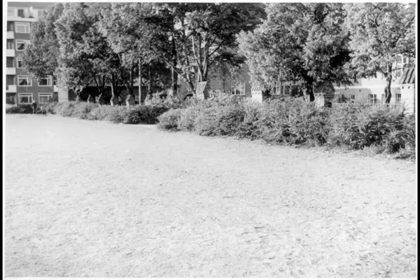 Hovedfasaden til Fagerborg gymnas (nåværende Fagerborg videregående skole) til høyre foran idrettsplassen omkranset av busker og trær. Bebyggelse i Fagerborggata i bakgrunnen. Albumtittel: "Sopus Bugges plass"