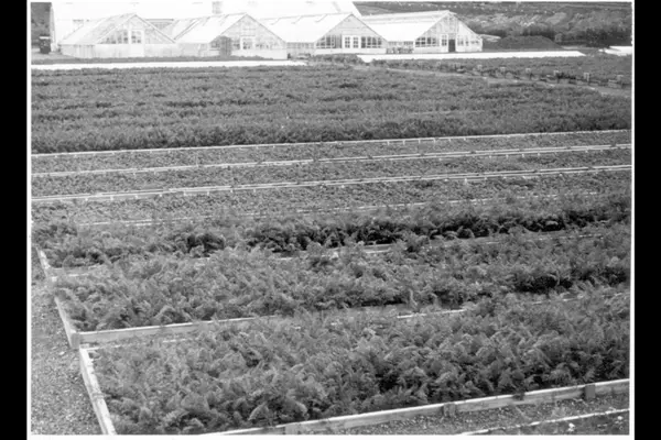Dyrkingsfelt for blomster på friland (Jfr. bilde A-20145/Uas/0028/006). Drivhus. Fra Vestre Sogn kommunale gartneri (planteskole). Albumtittel: "SOGN GARTNERI"