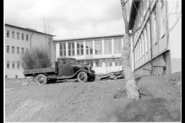 Østre bebyggelse / fløyer mot vinklet gårdsrom på Tåsen gamlehjem, nåværende Tåsen aldershjem. En Chevrolet lastebil (modell 1934/35) med buskvekster. Steinheller. Albumtittel: "TÅSEN - GL.HJEM."