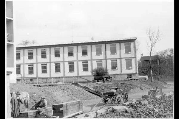 Østre bygning mot hjørnet Pastor Fangens vei / Vinkelveien på Tåsen gamlehjem, nåværende Tåsen aldershjem. Lastebil med buskvekster. Kantsteinsarbeide i gata. Redskapskasser. Hest og kjerre. Albumtittel: "TÅSEN - GL.HJEM."