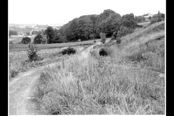 Østre del av Tøyenparken med gang / kjerrevei, dyrkingsarealer og skogholt. Stasjonsbygningen på Tøyen stasjon oppe til høyre? Albumtittel: "Tøyenarealene"