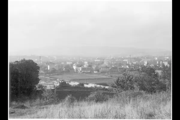 Utsiktsbilde over nordre Tøyenparken med veksthus og oppdyrkede arealer. Bebyggelse langs Finnmarkgata nærmest i bakgrunnen. Albumtittel: "Tøyenarealene"