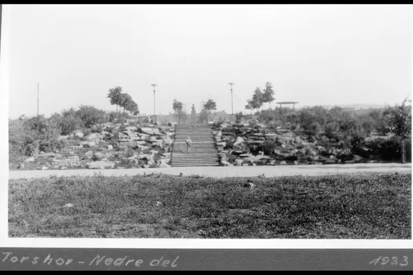 Hovedtrappen opp til Torshovparken. Fjellhave på begge sider. Byste av Fernanda Nissen, parklamper og taket på musikkpaviljongen i bakgrunnen. Busker og parktrær. Hegermanns gate i forgrunnen. Albumtittel: "Torshovparken"