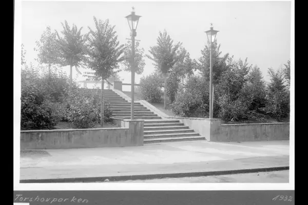 Nordre trapp opp til Torshovpark-platået fra Agathe Grøndahls gate. Parklamper, busker og parktrær. Taket på musikkpaviljongen i bakgrunnen. Albumtittel: "Torshovparken"