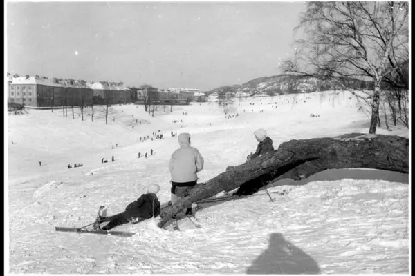 Barn og voksne i vinterlek. Ski. Snø. Bygningene på Søndre Åsen i bakgrunnen. Sigurd Lies gate, Fagerheimgata, (nåværende Jolly Kramer-Johansens gate.) Albumtittel: "Torshovdalen"