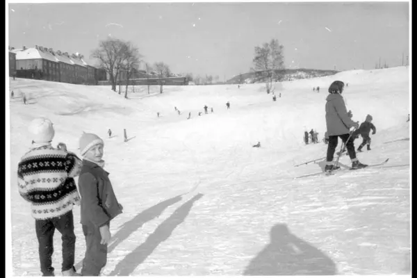 Barn og voksne i vinterlek. Snø. Bygningene i Sigurd Lies gate og Fagerheimgata (nåværende Joly Kramer-Johansens gate) i bakgrunnen. Albumtittel: "Torshovdalen"