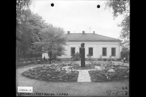Universitetshaven med portrettbyste av Nansen i midten. Folk som viler på parkbenkene. Gymnastikksalen i bakgrunnen. Albumtittel: "Universitetshaven & plassen. Uranienborg"