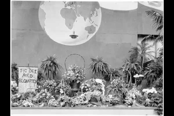Utstilling i Roald Amundsens gate, "Blomstene i hjemmet". Blomsteroppsatser fra "Eksotisk avdeling". Plakat med teksten: "Sig det med blomster". Albumtittel: "Utstillinger".