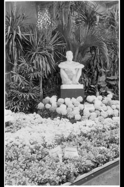 Utstilling i Roald Amundsens gate, "Blomstene i hjemmet". Blomsterbed med skulptur og premierte prydvekster. (Skilt med Første premie og Ærespremie i bedet). Palmer. Albumtittel: "Utstillinger"