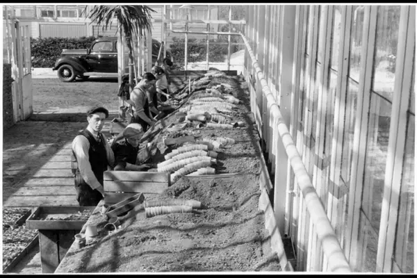 Drivhusarbeide. Arbeidere på Vestre Sogn kommunale gartneri planter blomster i potter. Bil parkert utenfor. (Jfr. bilde A-20145/Uas/0028/022) Albumtittel: "V. Sogn Gartnerier 1937 / 38"