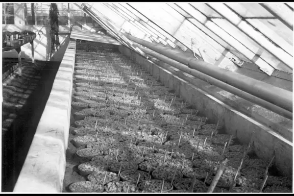 Drivhusmiljø. Nyspirede potteplanter med blomsterpinner. (Jfr. bilde A-20145/Uav/0001/020) Fra Vestre Sogn kommunale gartneri. Albumtittel: "V. Sogn Gartnerier 1937 / 38"