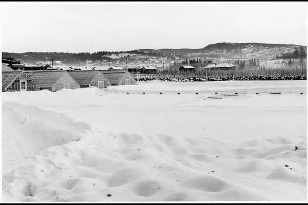 Gartneriområdet med drivhusene og snødekket uteareal sett mot nordøst mot Grefsenåsen. Fra Vestre Sogn kommunale gartneri. Albumtittel: "V. Sogn Gartnerier 1937 / 38"