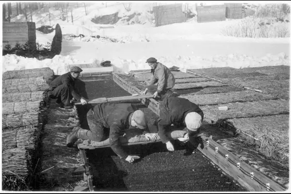 Vinterarbeide på Vestre Sogn kommunale gartneri (planteskole). Frøsetting i inngjerdet blomsterfelt. Halmpakninger mot kulda. Albumtittel: "V. Sogn gartneri"
