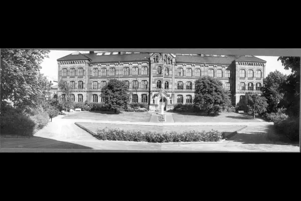 Vålerenga skole sett fra vest. Østre del av Vålerenga park ved Hjaltlandsgata med parkbenker, blomsterbed, busker og parktrær. Albumtittel: "Vålerengen Viktoria" (terrasse)