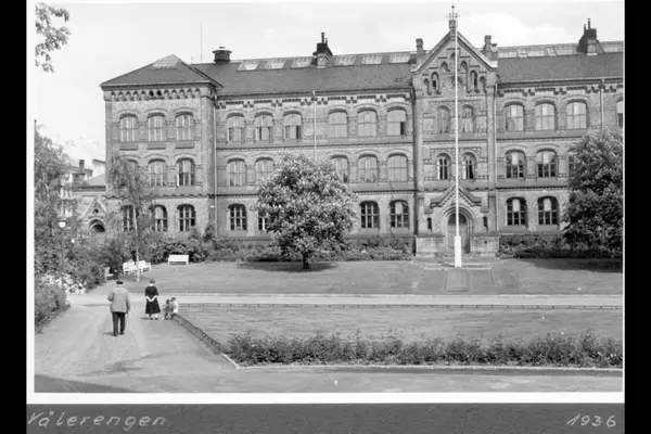 Vålerenga skole sett fra vest. Østre del av Vålerenga park langs Hjatlandsgata med parkbenker, blomsterbed, busker og parktrær. Albumtittel: "Vålerengen Viktoria" (terrasse)