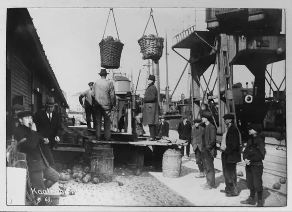 Kårabipartier losses på havna, heises på land i store bastkurver. Mange menn på kaia, arbeidere i arbeidstøy og caps, dresskledde menn med frakk og hatt - og noen unge gutter - alle står og ser på lossingen.