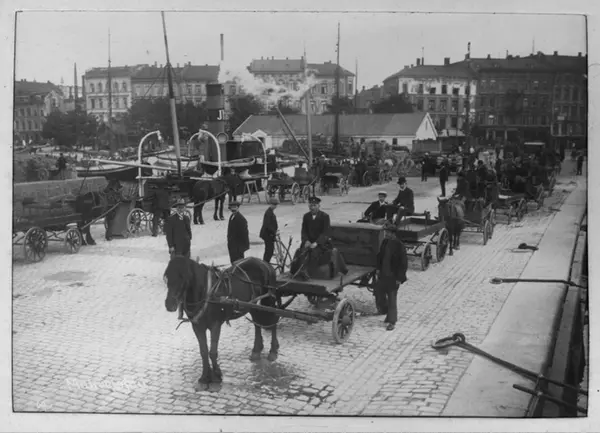 Havneliv, dampbåter, seilbåter, mange hest med kjerre, mange menn, lagerbygning på Tordenskjolds plass, masse trekasser utenfor, bygårdene fra tidligere Sjøgaten i bakgrunnen.