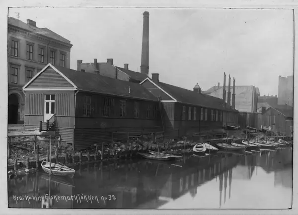 Akerselva fra Schweigaards bru mot Vaterland. Fortøyde elvebåter langs vestre bredd. Trehuset midt i bildet er Kristiania Kommunale Fiskematkjøkken, et populært tiltak i byen og langs kysten på 1920-30 tallet for å bedre det ernæringsmssige i befolkningen. Bak Elvegata og pipa til Holters tranraffineri, såpe og lysfabrikk på Vaterland.