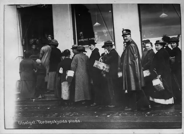Kvinner og menn i kø foran utsalget, en flott uniformskledd mann, politi?, kvinner med hatt og bastkurv. På vinduet står det: "Komunalt kjøttutsalg" inne på utsalget i Bogstadveien. Barn sees inne i utsalget.