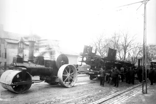 Dampveivals som trekker i damplokomotiv-chassis i gata. Lasten har forskjøvet seg, og det arbeides med å jekke den på plass igjen. Skarpsno (Drammensveien 84) i bakgrunnen. Se også A-20189/U/001/155. Tilbakemelding fra bruker: "Bildet er overveiende sannsynlig tatt før åpningen av Havnebanen i 1907, hvor gatetransporten av lokomotiver opphørte. Eneste lokomotiv av denne typen som Thune leverte før den tiden, var Gjøvikbanens nr. 144. Det ble levert 12. mai 1906, og bildet er derfor sannsynligvis tatt i månedskiftet april/mai 1906."